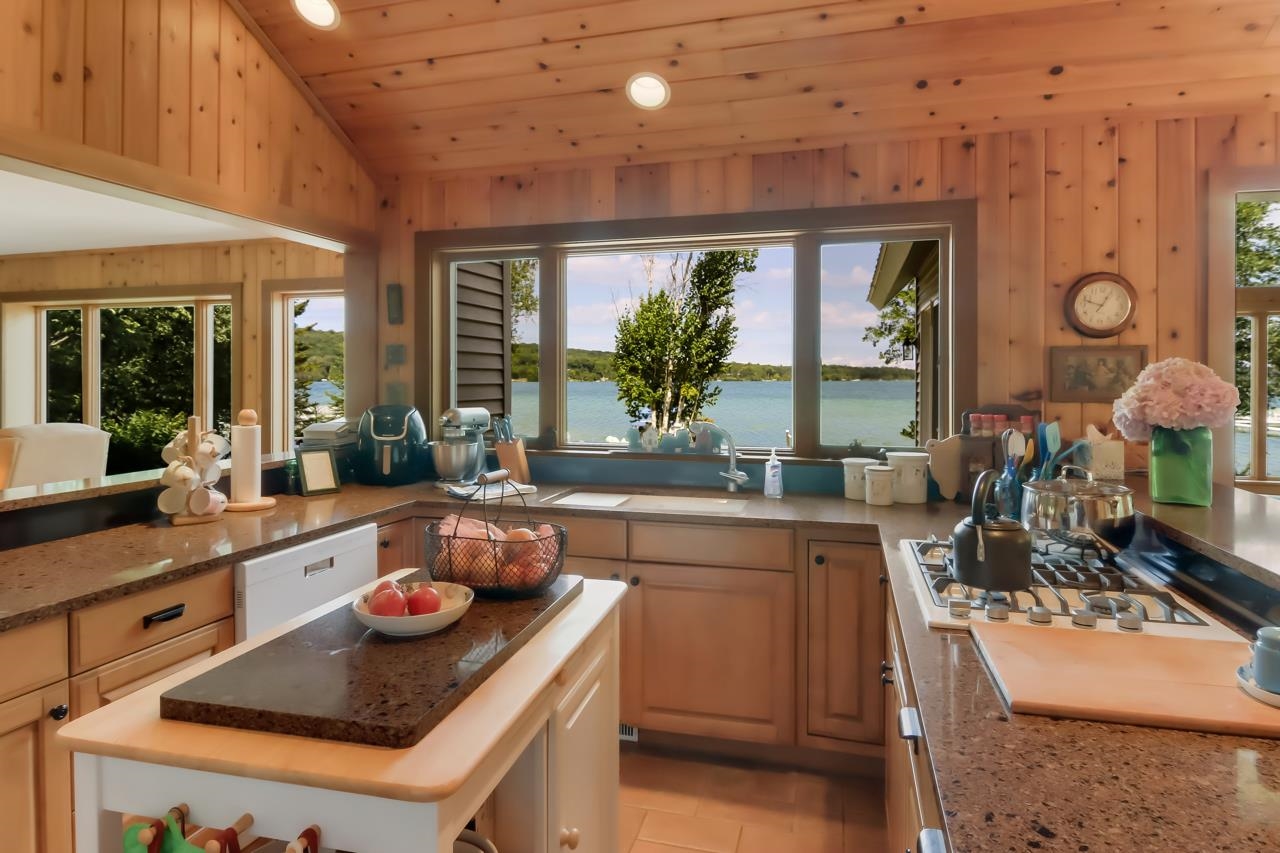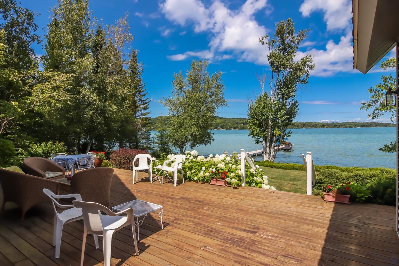 Located on the south shore of North Lake Leelanau at the end of a private road just 2.1 miles from Leland. Perfect all sports lake lifestyle with 121 feet of hard sand lake bottom. Open floor plan with a classic natural field stone fireplace, two master ensuite bedrooms, large deck, manicure lawn, vibrant perennial garden, and much more. Dock, pontoon boat, two jet skis, and hoists are available. Some furnishings are available as well.